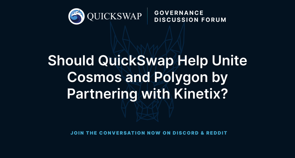 The purpose of this governance discussion is to ask the community if QuickSwap should partner with Kinetix to help unite the Cosmos and Polygon ecosystems and, if so, to decide on the amount of KFI rewards that will be distributed between the QuickSwap Stakers and Foundation.